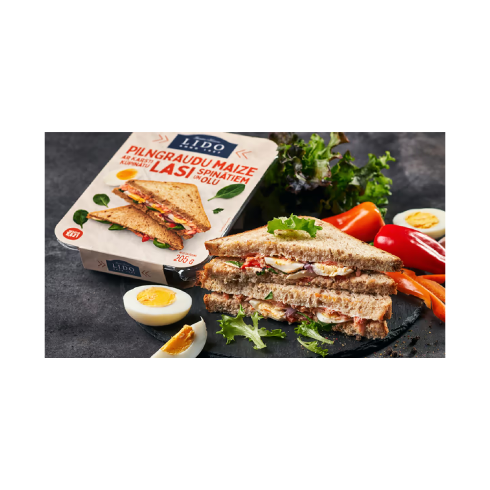 Tostermaize /Igaunija/ (42.3%) (pilngraudu KVIEŠU milti (54%), ūdens, diedzēti KVIEŠU graudi, diedzēti RUDZU graudi, KVIEŠU olbaltumvielas, cukurs, rapšu eļļa, sāls, kukurūzas ciete, konservants: sorbīnskābe, antioksidants: askorbīnskābe), OLAS (14.4%), LASIS (12%) (Atlantijas LAŠA (Salmo salar) fileja, sāls), mērce (majonēze (73%) (rapšu eļļa, ūdens, cukurs, OLU dzeltenuma pūlveris ar maltodekstrīnu, SŪKALU pulveris, sāls, skābuma regulētāji: citronskābe, etiķskābe, dzeramā soda, biezinātāji: pārveidota kukurūzas ciete, aromatizētājs, krāsviela: beta karotīns), kečups (ūdens, tomātu pasta, cukurs, modificēta kukurūzas ciete, sāls, skābuma regulētājs: citronskābe un etiķskābe, aromatizētāji, garšvielas), ķiploki, rapšu eļļa, mērce tobasko sarkanā (destilēts etiķis, sarkanie pipari, sāls)), SIERS (PILNPIENS, SALDAIS KRĒJUMS, sūkalu olbaltumvielu koncentrāts (no PIENA), pārtikas sāls, stabilizētājs: ceratoniju augļu sveķi, skābe: citronskābe, pienskābes kultūras), paprika marinēta (sarkanā paprika, ūdens, cukurs, brendija etiķis, sāls, olīveļļa, ķiploki, skābuma regulētājs: citronskābe), sarkanie sīpoli marinēti (sīpoli sarkanie (94%), garšvielas (cukurs, sāls, skābuma regulētājs: citronskābe, pretsalipes viela: silīcija dioskīds, laima sulas pulveris, raudene)), spināti (2.4%)