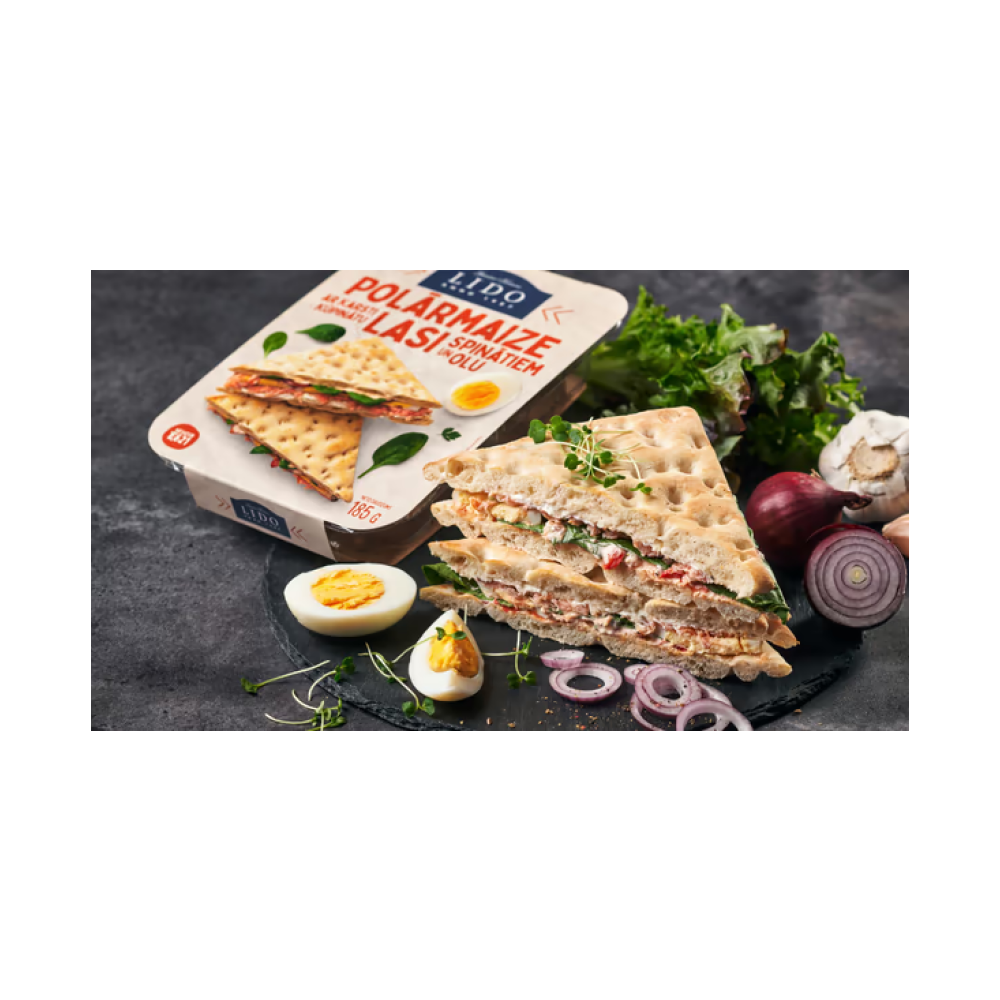 Polārmaize /Zviedrija/ (35.1%) (KVIEŠU milti, ūdens, RUDZU milti (22%), sīrups, cukurs, KVIEŠU GLUTĒNS, raudzēti KVIEŠU milti, rapšu eļļa, sāls, AUZU šķiedra, raugs, augu emulgatori: taukskābju mono un di- glicerīdi, nātrija stearoil-2-laktilāts, irdinātājs: amonija karbonāti, iesala milti (MIEŽI), miltu apstrādes līdzeklis: citronskābe), OLAS (16.2%), LASIS (13.5%) (Atlantijas LAŠA (Salmo salar) fileja, sāls), mērce (majonēze (73%) (rapšu eļļa, ūdens, cukurs, OLU dzeltenuma pūlveris ar maltodekstrīnu, SŪKALU pulveris, sāls, skābuma regulētāji: citronskābe, etiķskābe, dzeramā soda, biezinātāji: pārveidota kukurūzas ciete, aromatizētājs, krāsviela: beta karotīns), kečups (ūdens, tomātu pasta, cukurs, modificēta kukurūzas ciete, sāls, skābuma regulētājs: citronskābe un etiķskābe, aromatizētāji, garšvielas), ķiploki, rapšu eļļa, mērce tobasko sarkanā (destilēts etiķis, sarkanie pipari, sāls)), SIERS (PILNPIENS, SALDAIS KRĒJUMS, sūkalu olbaltumvielu koncentrāts (no PIENA), pārtikas sāls, stabilizētājs: ceratoniju augļu sveķi, skābe: citronskābe, pienskābes kultūras), paprika marinēta (sarkanā paprika, ūdens, cukurs, brendija etiķis, sāls, olīveļļa, ķiploki, skābuma regulētājs: citronskābe), sarkanie sīpoli marinēti (sīpoli sarkanie (94%), garšvielas (cukurs, sāls, skābuma regulētājs: citronskābe, pretsalipes viela: silīcija dioksīds, laima sulas pulveris, raudene)), spināti (2.7%)