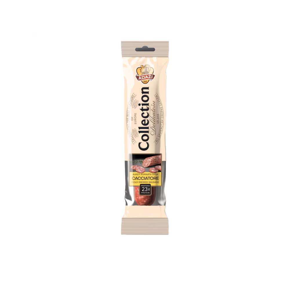 • cūkgaļa (100 g desas ražošanai izmantoja 94 g cūkgaļas); cūku speķis (100 g desas ražošanai izmantoja 39 g speķa); ūdens; liellopu gaļas kolagēna proteīns; dekstroze; dabīga krāsviela: karmīns, hemoglobīns (cūkgaļas); sāls; PIENA olbaltumvielas; stabilizētājs: polifosfāts; maltodekstrīns; LAKTOZE; garšas pastiprinātājs: mononātrija glutamāts; garšvielas (melnie pipari, baltie pipari, koriandrs); antioksidanti: nātrija askorbāts, askorbīnskābe, glukonskābes delta laktons; garšvielu ekstrakti; aromatizētājs; konservants: nātrija nitrīts. Apvalks neēdams. Cūkgaļas izcelsme-ES