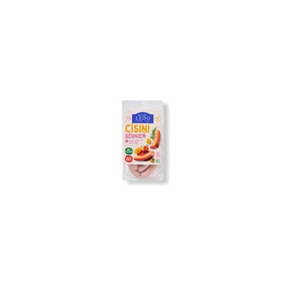 Cīsiņi "Bērniem" viegli kūpinātiSastāvdaļas:cūkgaļa (42,7%), liellopu gaļa (28,5%), ūdens, ciete kartupeļu, garšvielu ekstrakti, buljona granulāts (garšvielas, sāls, rapšu eļļa), stabilizētājs: E450, garšvielas, antioksidants: E300, sāls, cūkgaļas speķis (0,95%), dekstroze, konservants: nātrija nitrītsUzturvērtība 100g produkta: Enerģētiskā vērtība: 1145kJ/ 276kcal, tauki: 21g, tostarp piesātinātās taukskābes: 7,46g, ogļhidrāti: 3,1g, tostarp cukuri: 0,98g, olbaltumvielas: 18g, sāls: 1,21g Pēc iepakojuma atvēršanas izlietot 48 h laikā. Produkts iepakots aizsargatmosfērā. Apvalks ir paredzēts lietošanai uzturā.